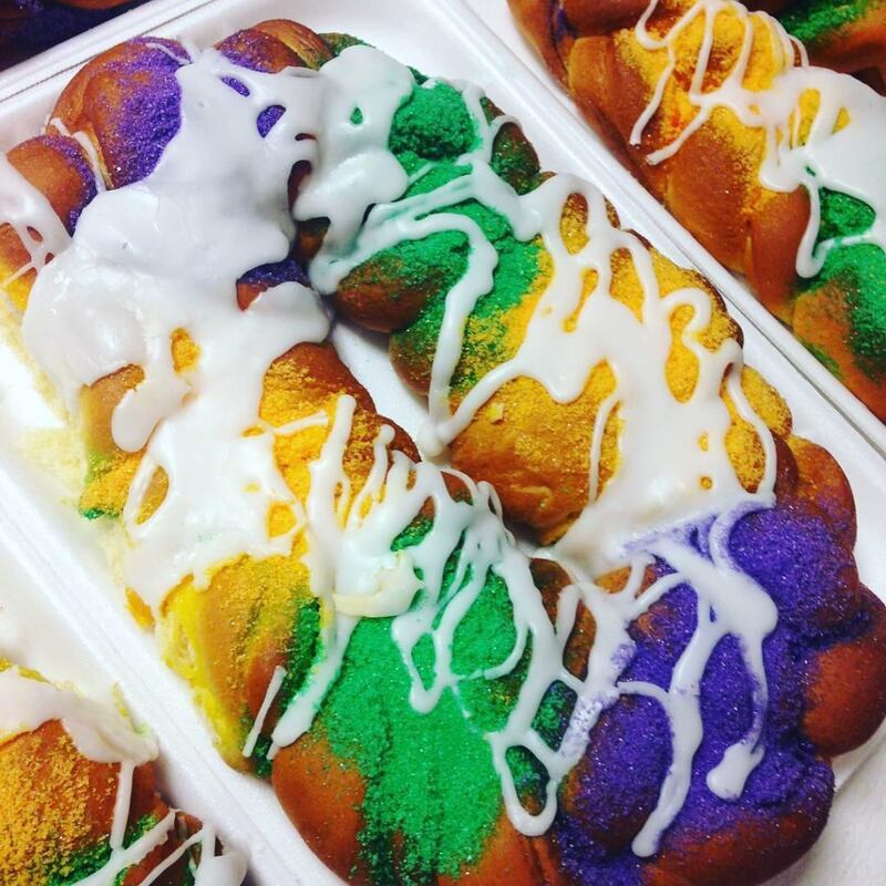 Antoine’s Famous Cakes is the “Home of the Queen Cake,” a king cake created with multiple fillings. The brioche cake is layered with thick white icing and drizzles of Mardi Gras colors, a departure from the traditional granulated sugar. King cake lovers can stop by the original Gretna location or the second Metairie location.